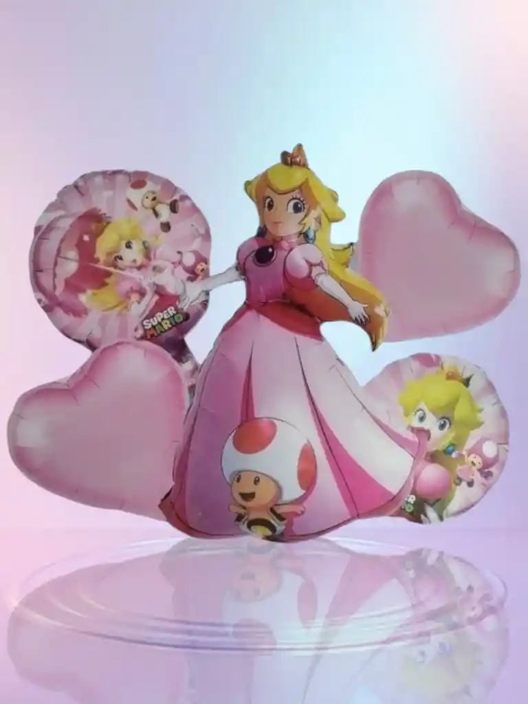 Bouquet X5 Globos Metálizados Princesa Peach Por tu Compra llevas: •1 Globo Princesa Peach 72x44cm •2 Globos Corazón Rosado 45x45cm c/u •2 Globos Redondo Estampado 45x45cm c/u NOTA: •Los Globos se pueden inflar con Helio * Los Globos Se envían Desinflados