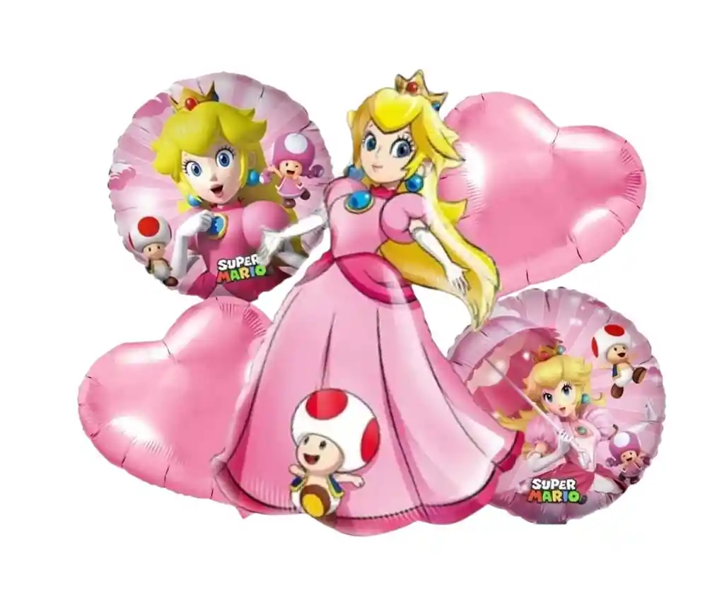 Bouquet X5 Globos Metálizados Princesa Peach Por tu Compra llevas: •1 Globo Princesa Peach 72x44cm •2 Globos Corazón Rosado 45x45cm c/u •2 Globos Redondo Estampado 45x45cm c/u NOTA: •Los Globos se pueden inflar con Helio * Los Globos Se envían Desinflados