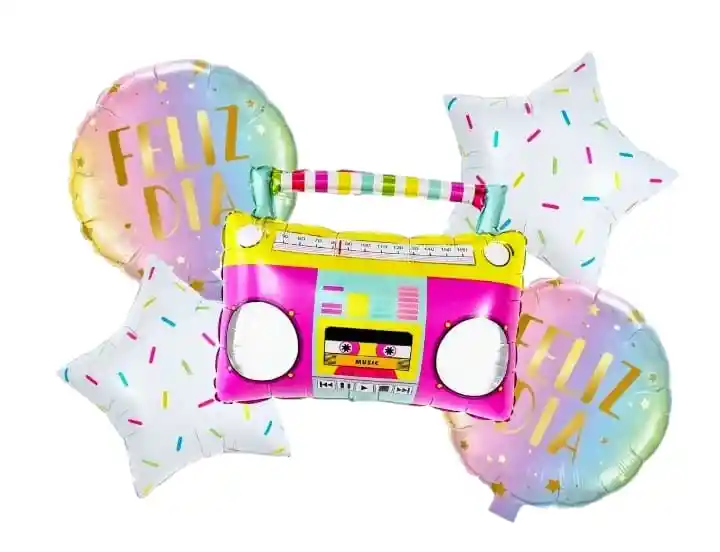 Bouquet x5 globos metalizados Por tu Compra llevas: •1 Globo Grabadora: 60x55cm •2 Globos Estrella 45x45cm •2 Globos Redondo 45x45cm Tener en Cuenta: •Los Globos se envían Desinflados