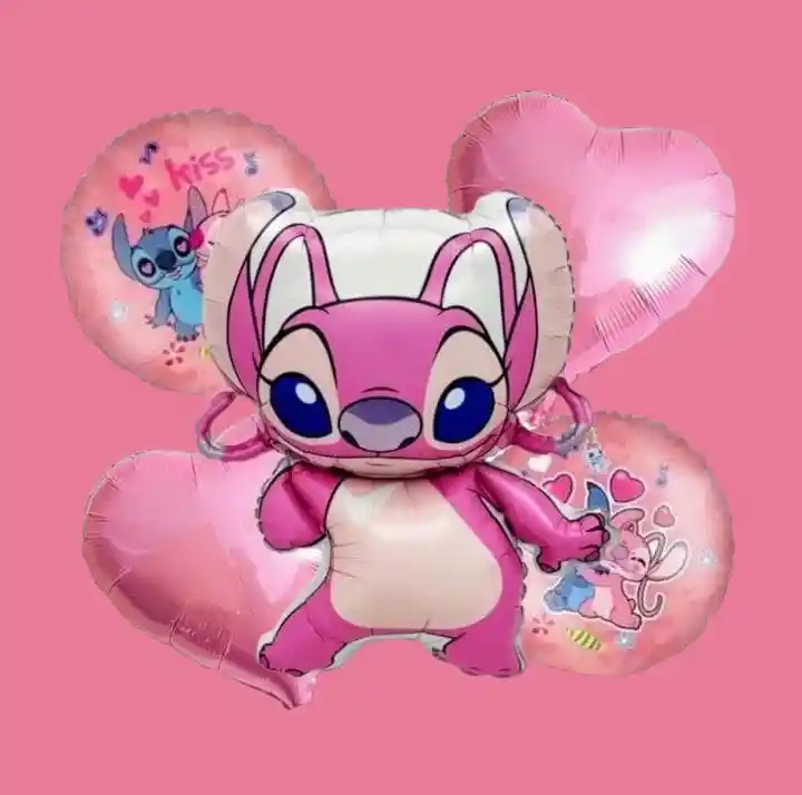 Por tu compra llevas: •1 Globo metalizado Angel: 65x55cm •2 Globos Corazón 45x45cm •2 Globos Estampado Stitch y Angel 45x45cm Tener en Cuenta: •Los Globos se envían Desinflados