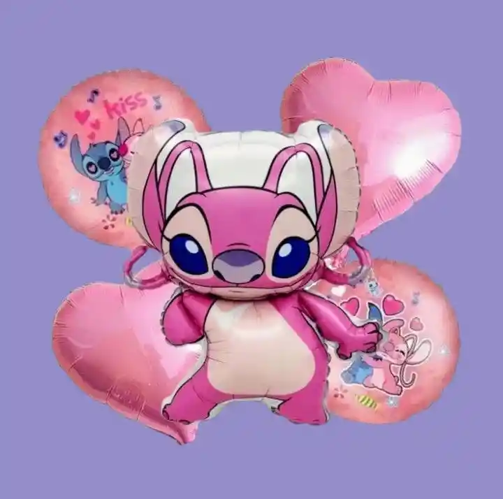 Por tu compra llevas: •1 Globo metalizado Angel: 65x55cm •2 Globos Corazón 45x45cm •2 Globos Estampado Stitch y Angel 45x45cm Tener en Cuenta: •Los Globos se envían Desinflados