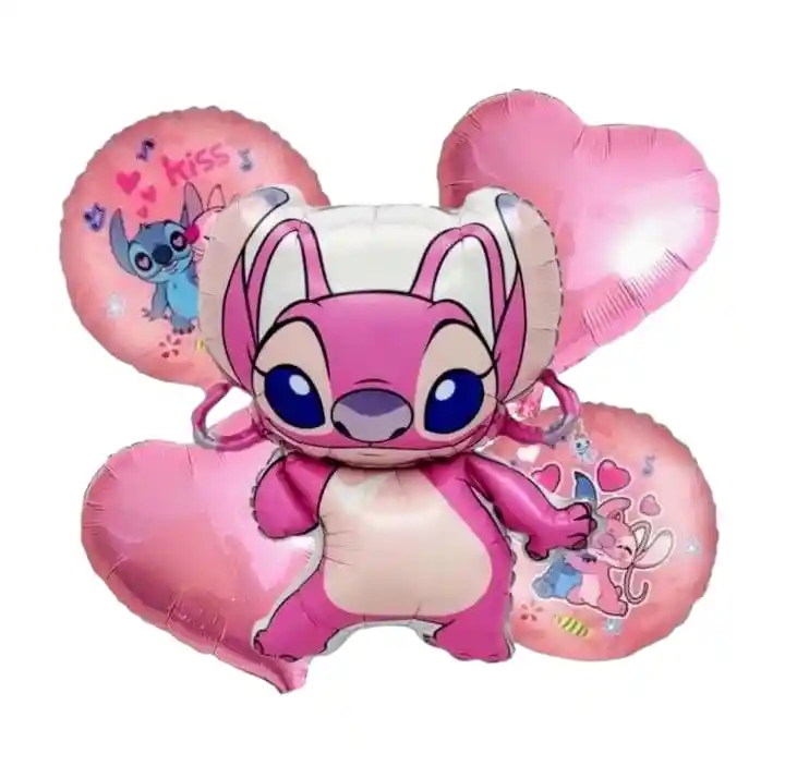 Por tu compra llevas: •1 Globo metalizado Angel: 65x55cm •2 Globos Corazón 45x45cm •2 Globos Estampado Stitch y Angel 45x45cm Tener en Cuenta: •Los Globos se envían Desinflados