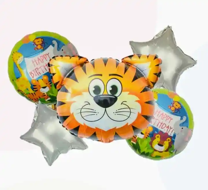 Bouquet X5 Globos Metálizados Tigre •1 Cara de Tigre: 65x65cm •2 Estrellas Plateadas 45x45cm (cada una) •2 Globos Redondos 45x45cm Nota: •Los Globos se pueden inflar con Helio •Los Globos se envían Desinflados