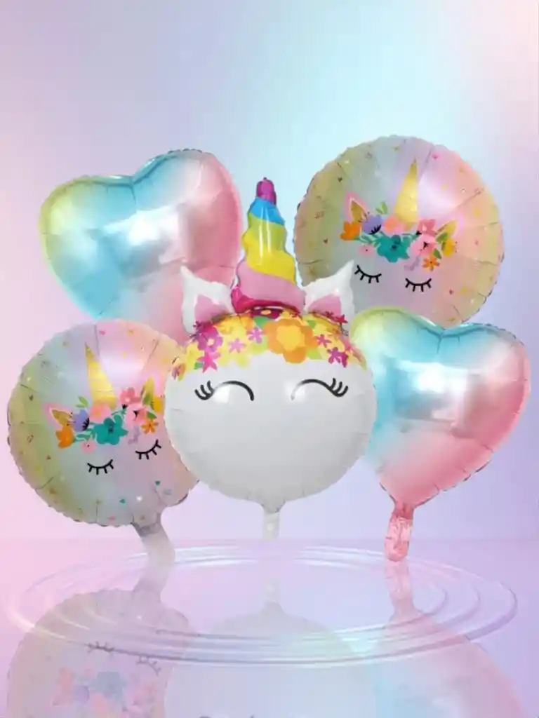 Bouquet X5 Globos Metálizados Unicornio Por tu Compra llevas: •1 Globo Unicornio 55x75cm •2 Globos Corazón 45x45cm •2 Globos Redondo Diseño Del Unicornio 45x45cm NOTA: •Los Globos se pueden inflar con Helio * Los Globos vienen Desinflados