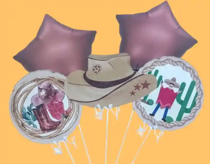 Globos Metalizados X5 Globos Vaquero Por tu Compra llevas: 5 Globos Metálizados •1 Sombrero: 62x44cm •2 Estrellas Metalizadas 45x45cm •2 Globos Redondos Vaquero 45x45cm NOTA * Se pueden Inflar con Helio * Los Globos se venden Desinflados