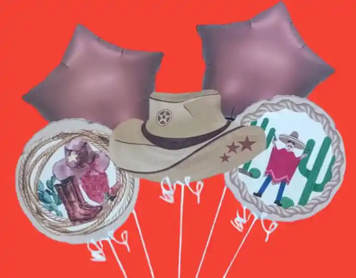 Globos Metalizados X5 Globos Vaquero Por tu Compra llevas: 5 Globos Metálizados •1 Sombrero: 62x44cm •2 Estrellas Metalizadas 45x45cm •2 Globos Redondos Vaquero 45x45cm NOTA * Se pueden Inflar con Helio * Los Globos se venden Desinflados
