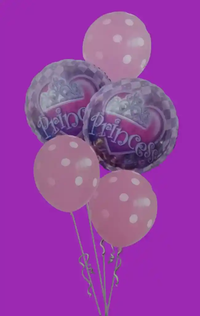 Bouquet X5 Globos Por tu Compra llevas: •2 Globos Metálizados Redondo Princess 45x45cm •3 Globos Látex Rosado Puntos Blancos R12 NOTA: •Los Globos se pueden inflar con Helio •Los Globos Se envían Desinflados