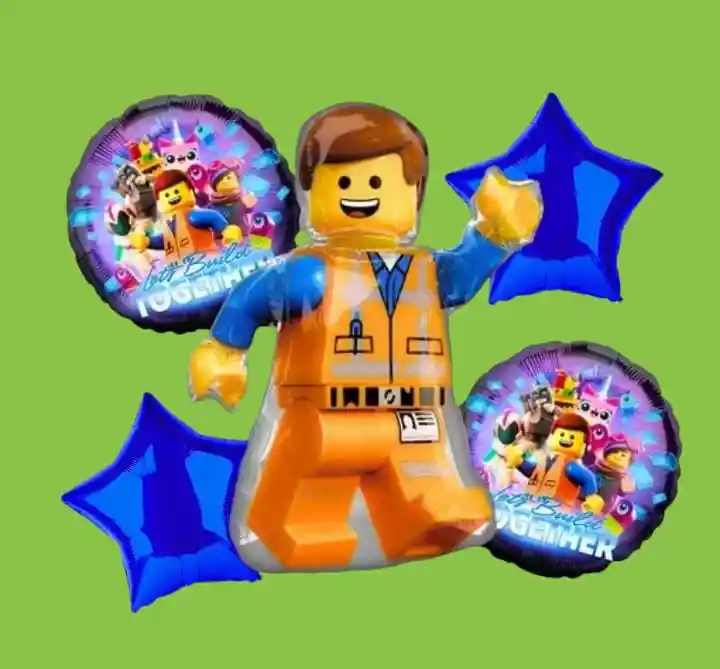 Por tu compra te llevas: •1 Globo figura Lego Emmet 65x 45 cm •2 Globos estrella 45 x 45cm •2 Globos Circular Lego Movie 45 x 45 cm Tener en Cuenta: •Los Globos se envían Desinflados