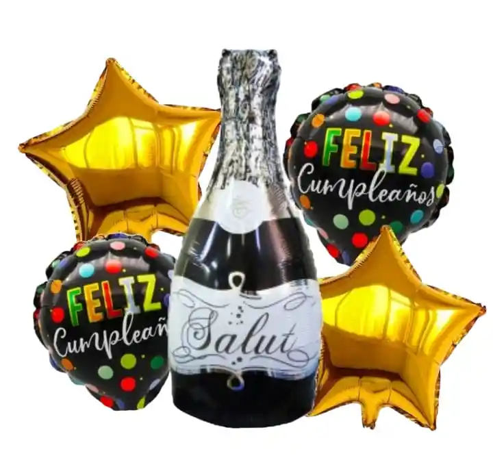 Bouquet X5 Globos Metálizados Champagne 1 Champagne Negra/Plateado 101.6x50.8cm 2 Globos Redondos Feliz Cumpleaños 45x45cm 2 Globos Estrella Dorada 45X45cm Nota: •Los Globos vienen Desinflados •Se pueden Inflar con Helio