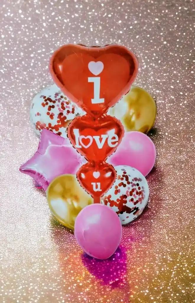 Celebra el Amor con estos Hermosos Globos Por tu Compra llevas 8 Globos •1 Globo Metalizado 3 Corazónes i love u •1 Globos Estrella metalizado •4 Globos Latex •2 Globos Latex con Confeti Nota: •Los Globos se entregan desinflados •Son Aptos para inflar con Helio