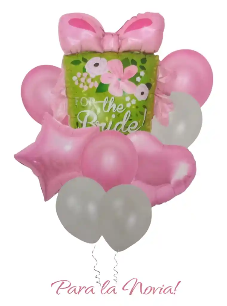 Bouquet X9 Globos Por tu Compra llevas: •1 Globo Metálizado Regalo "Para la Novia" 80X75 cm •1 Globo Metálizado Corazón: 45x45cm •1 Globo Metálizado Estrella: 45x45cm •3 Globos Látex Rosados X12 •3 Globos Látex Blanco R12 NOTA: •Los Globos se pueden inflar con Helio •Los Globos Se envían Desinflados
