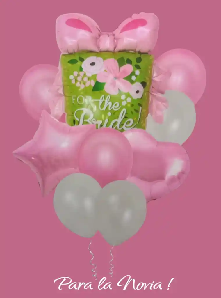 Bouquet X9 Globos Por tu Compra llevas: •1 Globo Metálizado Regalo "Para la Novia" 80X75 cm •1 Globo Metálizado Corazón: 45x45cm •1 Globo Metálizado Estrella: 45x45cm •3 Globos Látex Rosados X12 •3 Globos Látex Blanco R12 NOTA: •Los Globos se pueden inflar con Helio •Los Globos Se envían Desinflados