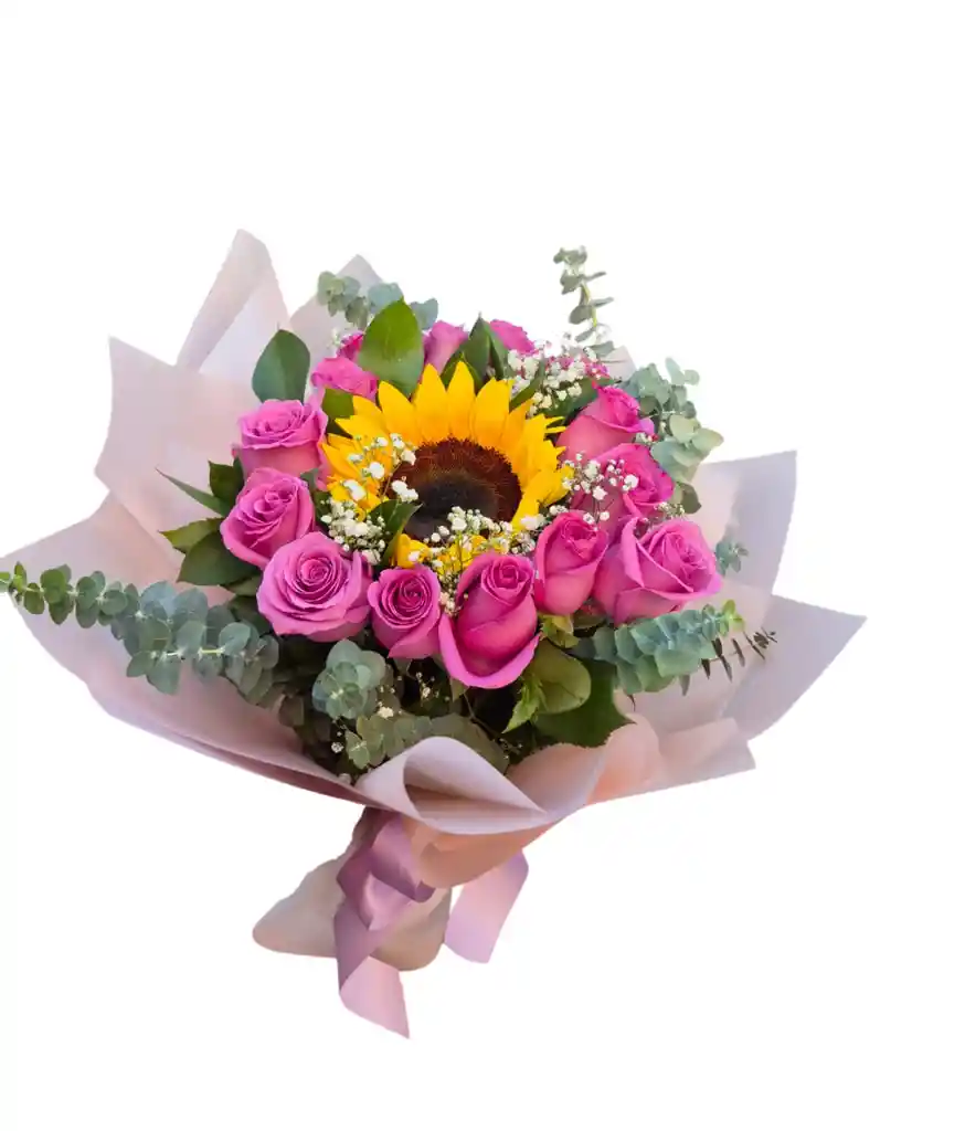 bouqueth de 1 girasol, 12 rosas, eucalipto, con papel decorativo con moño y tarjeta personalizada si el cliente lo desea. *El color de la rosa puede variar