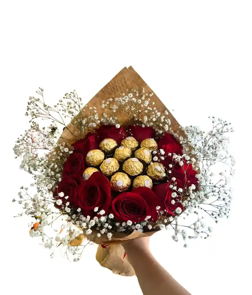 Ramo mediano con 12 rosas rojas, 12 chocolates ferrero roches, rodeados de gipso y tarjeta personalizada si el cliente lo desea.
