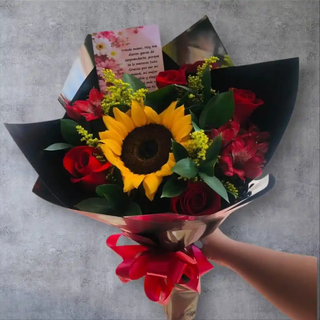 Bouquets decorado con 6 rosas y 1 girasol con su molo