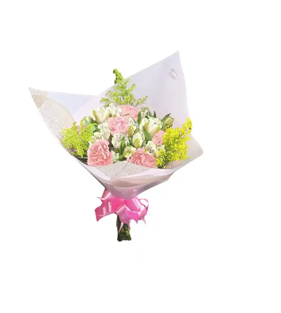 bouquets de astromelia blanca, clavel rosado, aster, envuelto en papel coreano, un moño, el papel coreano puede cambiar según disponibilidad.