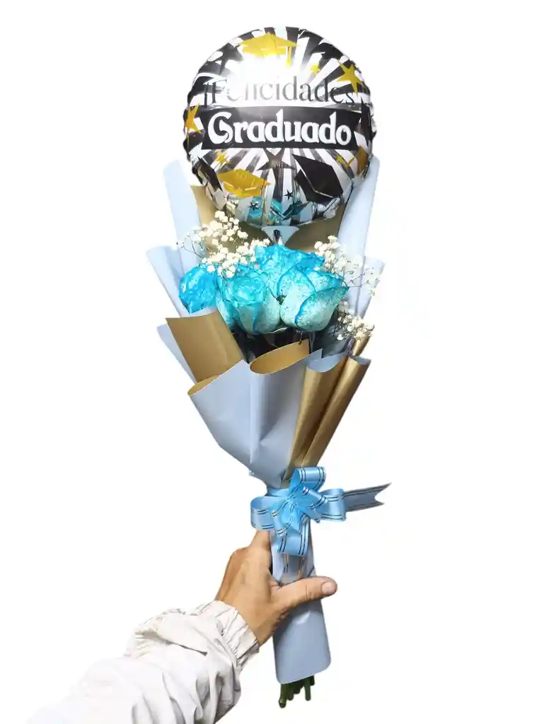 bouquets de 6 rosas azules, perla blanca, un globo de grado (la temática del globo se puede cambiar).