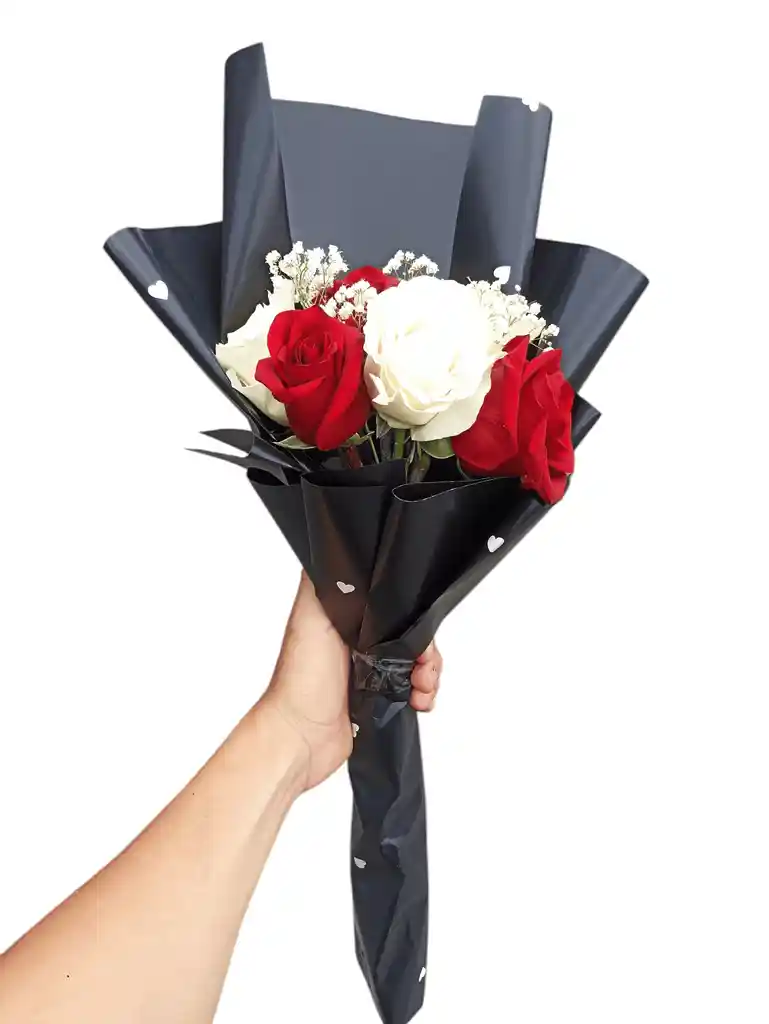 bouquets de 9 rosas, 5 rojas, 3 blancas, envuelto en papel coreano.