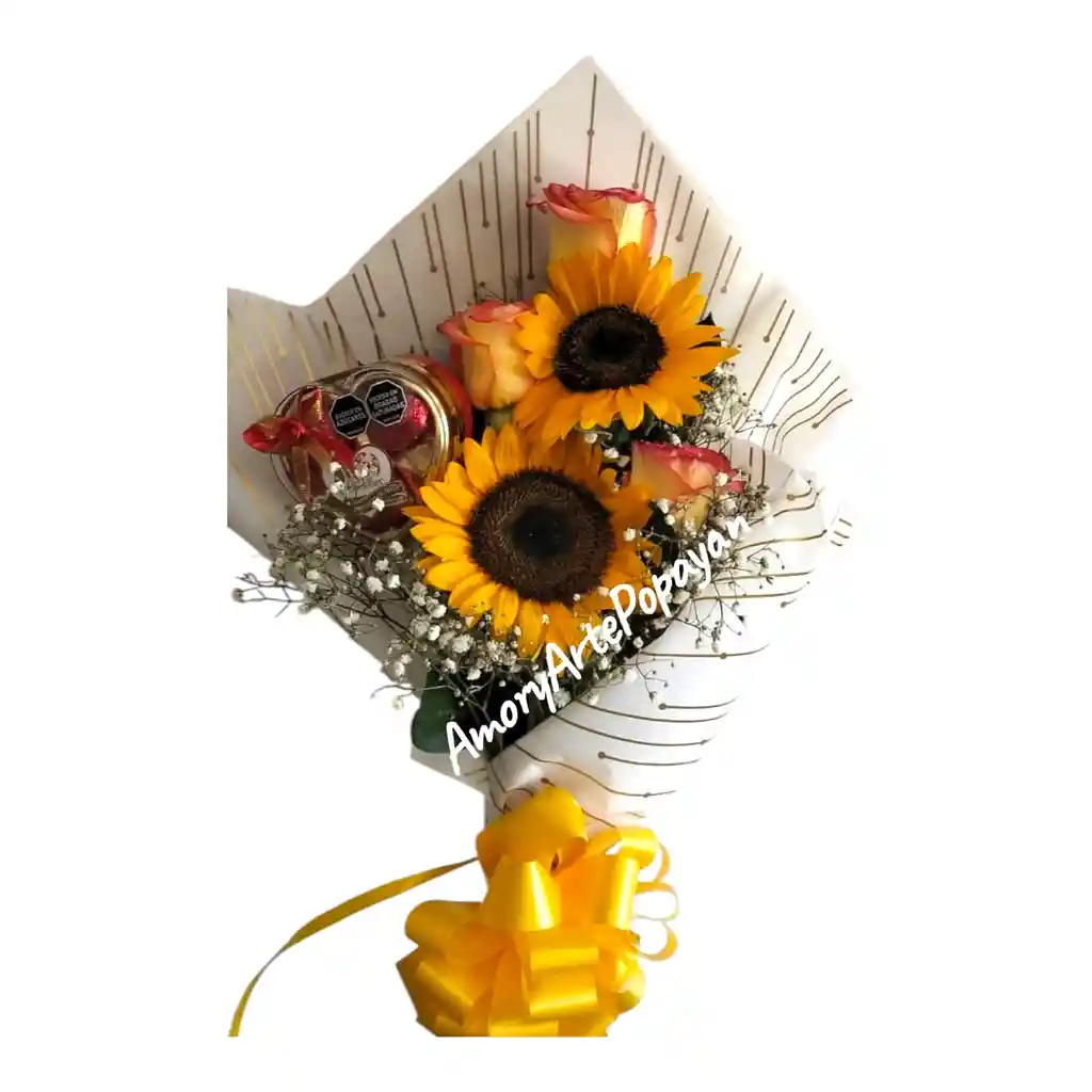 DIVINO BOUQUETS DE ROSAS,GIRASOLES,FOLLJES,CHOCOLATE CORAZON PEQUEÑO,CON SU ENVOLTURA DE PAPEL COREANO SEGUN EXISTENCIA Y MOÑO EN CINTA DE PAPEL