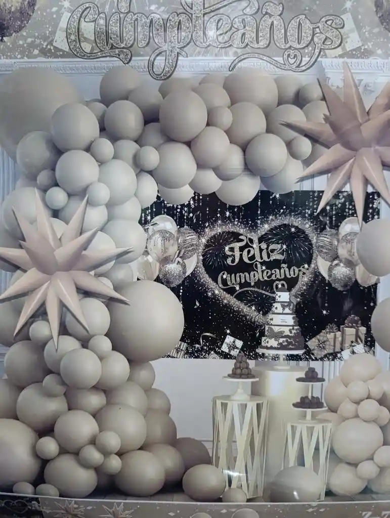 ransforma cualquier celebración en un evento de lujo con nuestro Set Glam Beige Cumpleaños Premium. Incluye un espectacular arco orgánico de globos en tonos beige mate, estrellas decorativas en relieve y fondo temático con mensaje de “Feliz Cumpleaños