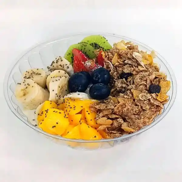 Bowl Griego con Yogurt, Banano, Mango, Fresa, Kiwi, Arándanos, Granola y Semillas de Chía Rico en vitaminas A, B, C y E, Potasio, Magnesio, Fibra, Antioxidantes y Omegas. Aporta energía sostenida, mejora la digestión y ayuda a mantener la saciedad de forma saludable.