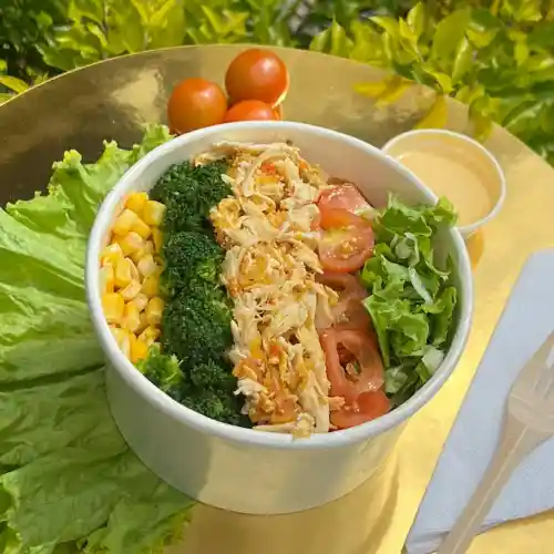 Base de mix lechuga crespa y batavia, pollo guisado desmechado, brócoli, zanahoria fresca y tomates cherrys, aderezo de maracuyá. (la de la imagen tiene adicional de maicitos)