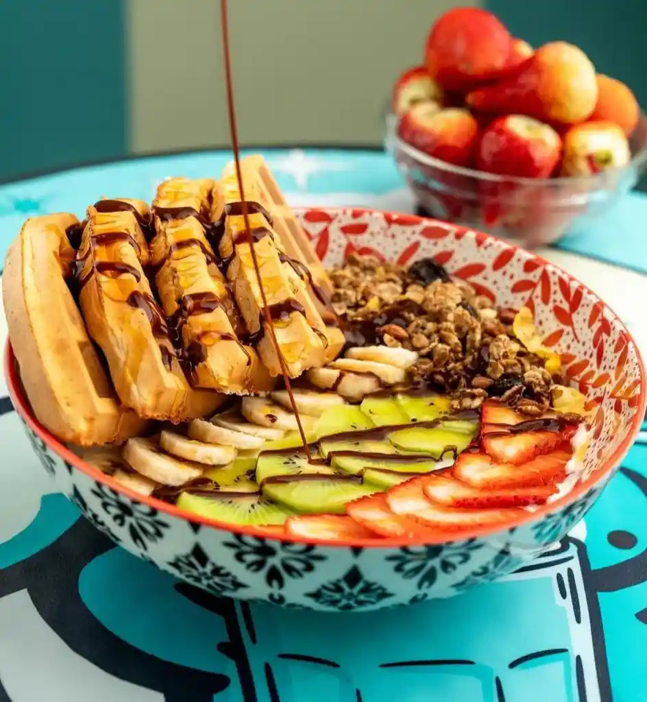 Delicioso waffle saludable con proteína, crujiente por fuera y suave por dentro. Servido en bowl y acompañado de frutas frescas y toppings naturales que aportan energía y nutrición. Perfecto para un desayuno o snack balanceado sin dejar de disfrutar algo dulce 🧇💪 160gr de yogur griego sin azúcar waffle con 20gr de proteína endulzado con miel y/o chocolate sin azúcar ni calorías Toppings: granola/hojuelas de maíz/almendras/maní/coco/Chisp de chocolate