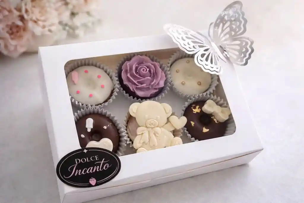 Nuestro Box de 6 Mini Donas es pura magia en cada pieza: acompañadas de una rosa de chocolate hecha a mano, un osito de chocolate blanco con corazones, mini donas con glaseado chocolate oscuro y papel comestible de oro, donas en chocolate blanco con confeti rosa y perlas doradas. Cada dona es una obra pequeña. Cada caja es un regalo completo. Presentadas en caja blanca con ventana, una mariposa y capacillos individuales — listas para regalar sin envolver nada más. puedes enviar tu mensaje para crear una tarjeta personalizada.