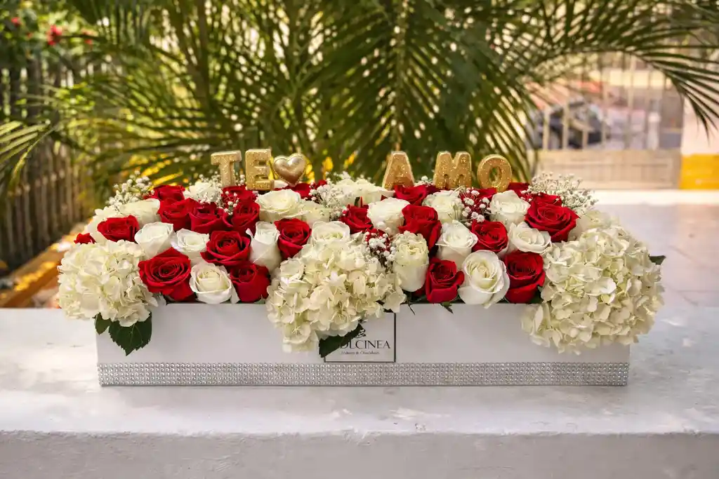 Caja de madera 60 rosas naturales y hortensias letras de chocolate TE AMO