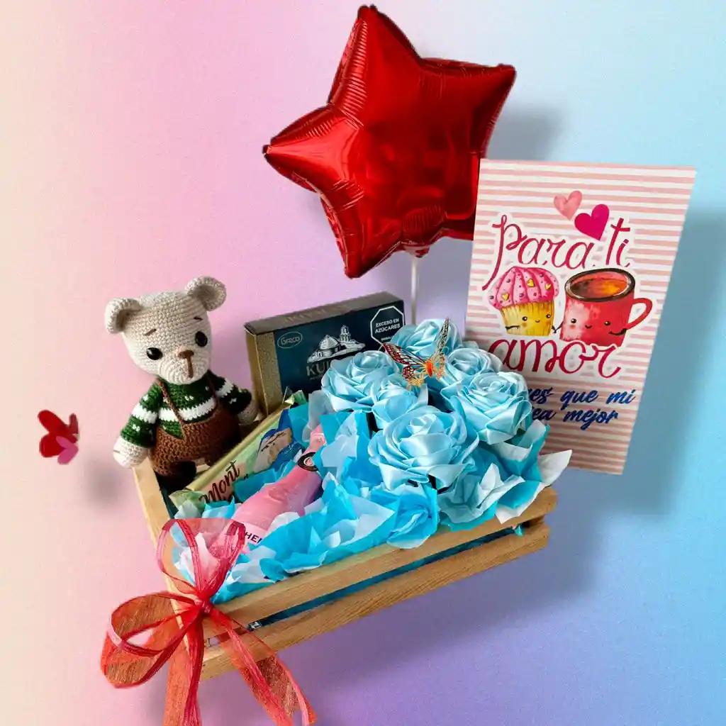 Un regalo tierno y especial que incluye: amigurumi osito tejido a mano 21cm, globo metalizado con mensaje, rosas eternas, Vino Espumoso Jp Chenet Ice Edition Rosado 200 ml, chocolatina Montblanc 40g, galletas Kurabie 80g, bandeja de madera, tarjeta personalizada con tu mensaje, moño y empaque especial.