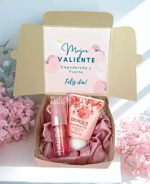 Sorprende a esa mujer especial con un detalle diseñado para consentirla. Este kit combina frescura y estilo en un solo lugar, perfecto para recordarles lo extraordinarias que son. Tu detalle incluye: ✨ Cuidado: Crema de manos hidratante (formato ideal para el bolso). 💄 Brillo: Gloss labial para una sonrisa radiante. 🎀 Estilo: Bamba (scrunchie) de tendencia para el cabello. 💌 Personalización: Tarjeta con tu mensaje especial. 🎁 Presentación: Caja de cartón ecológica