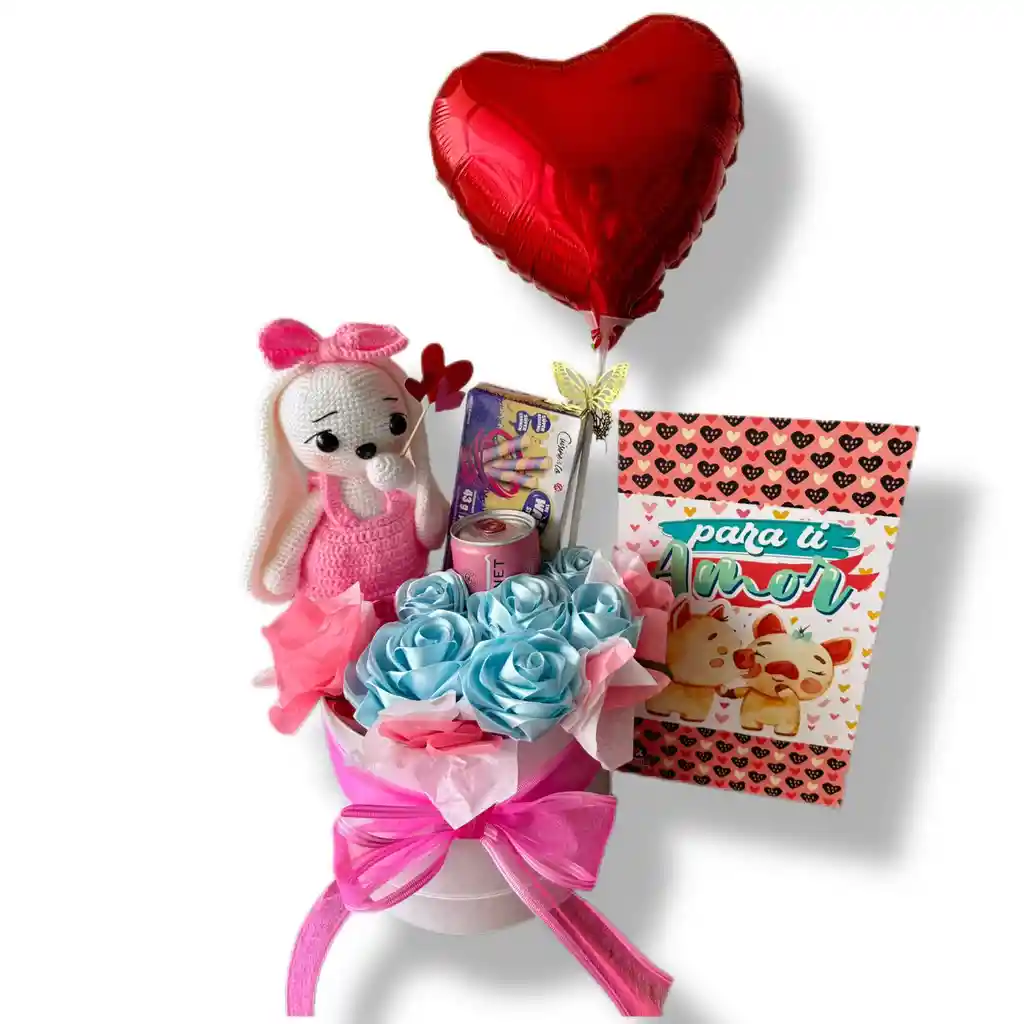 Un regalo único que incluye: amigurumi conejita tejida a mano (23cm), globo metalizado con mensaje, rosas eternas, Vino Espumoso Jp Chenet Ice Edition Rosado en lata 250 ml, barquillos 130g, bandeja de madera, tarjeta personalizada con tu mensaje, moño y empaque especial.