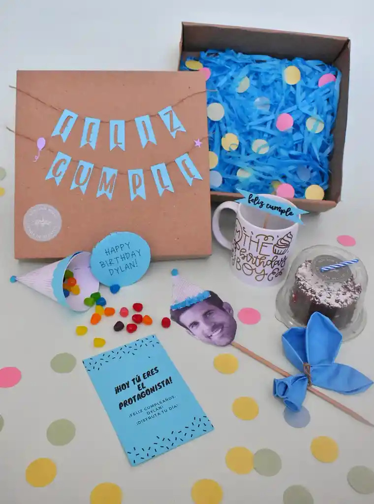La Box celebración tiene todo lo que necesitas para festejar, puede usarse para cumpleaños, aniversarios, felicitaciones, bienvenidas, despedidas, etc. Contiene: Mini torta de chocolate y arequipe., mug personalizado, topper personalizado con foto, gorro de papel con gomas de colores, globos, tarjeta con mensaje personalizado, tarjeta y vela “Los mejores deseos para ti”, caja con decoración personalizada. Envíar mensaje para la tarjeta vía chat.
