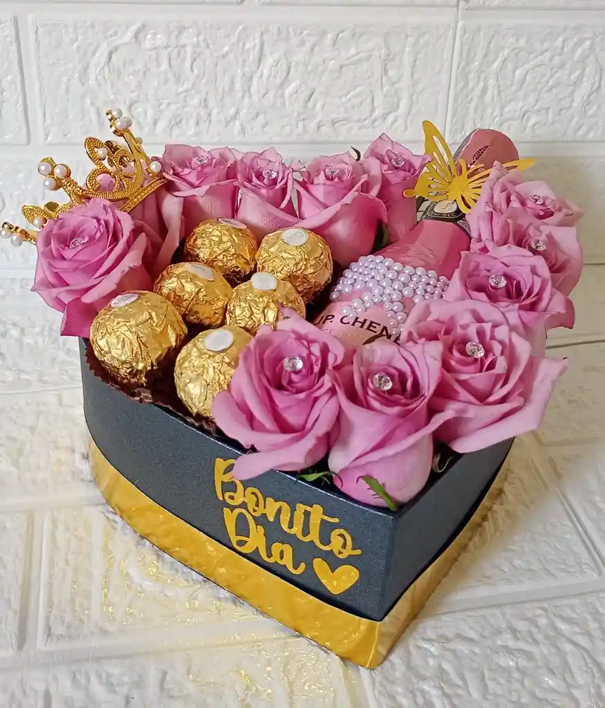 BOX CORAZON ROSAS ROSADAS, FERREROS, VINO JP, MINI CORONA