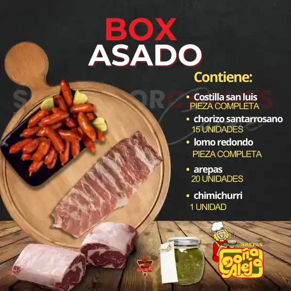 COSTILLA SAN LUIS (pieza completa) CHORIZO SANTARROSANO (15 unidades) LOMO REDONDO (pieza completa ) AREPAS (15 unidades) CHIMICHURRI (1 unidad)