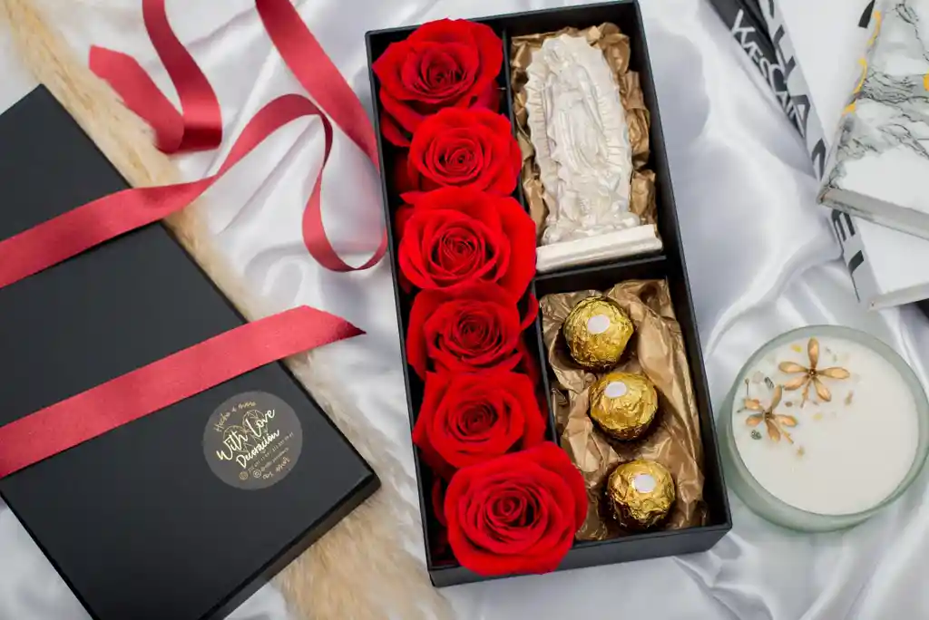 Caja de Lujo con Virgen de Guadalupe 12Cms, 3 Ferreros y Rosas color a elección según disponibilidad de Temporada