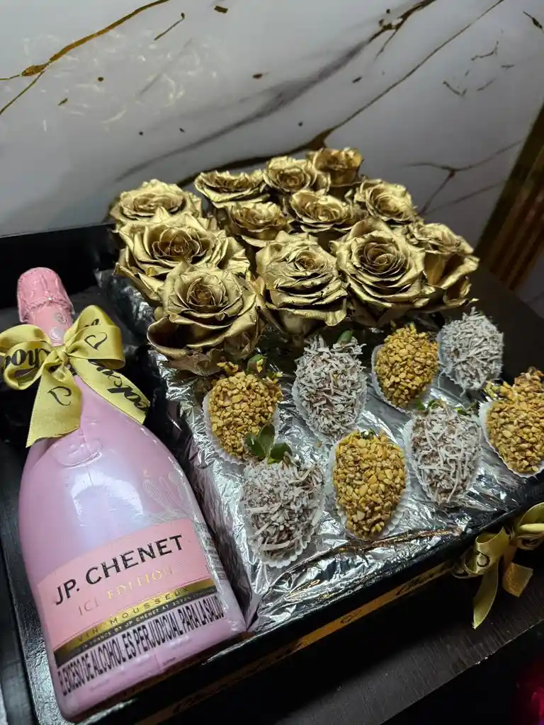 Hermosas rosas en tono dorado, símbolo de elegancia y distinción, Fresas cubiertas de chocolate, decoradas con coco y crocante de maní ,JP. Chenet Ice Edition, vino espumoso francés perfecto para celebrar momentos especiales.