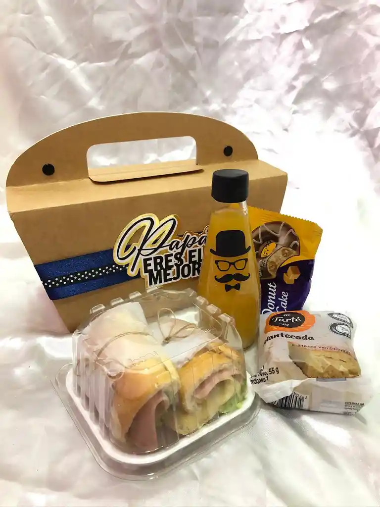 Nuestra Box siempre son ideales para sorprender a nuestros seres queridos. Caja personalizada estilo lonchera con frase "feliz día" Incluye: Sandwich con jamón extra, jamón, queso y vegetal. Jugo Postre (mantecada) Chocolate según disponibilidad