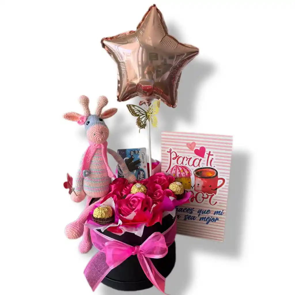 Un regalo especial que incluye: amigurumi jirafa tejida a mano (35cm), globo metalizado con mensaje, rosas eternas, 3 bombones Ferrero Rocher, barquillos 130g, bandeja de madera, tarjeta personalizada con tu mensaje, moño y empaque especial.