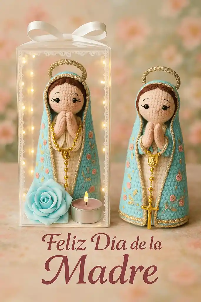 Sorprende a esa mujer que lo merece todo con un regalo lleno de fe y ternura. Hecho a mano: Virgen amigurumi tejida en material premium, bordada con flores y acabados dorados. (color a disponibilidad) Vitrina iluminada: Caja acrílica transparente con micro luces LED (pilas incluidas) lista para obsequiar. Accesorios incluidos: Mini rosario metálico dorado. Rosa tipo “eternal flower” en tono aqua. Vela pequeña de larga duración. Medidas: 20 cm alto (aprox.) vitrina 23 cm × 10 cm. Empaque seguro y tarjeta de “Feliz Día de la Madre”. ¡¡¡TU PEDIDO INCLUYE TARJETA!!! INGRESA EL MENSAJE QUE DESEAS ENVIAR EN: "COMENTARIO AL SHOPPER"