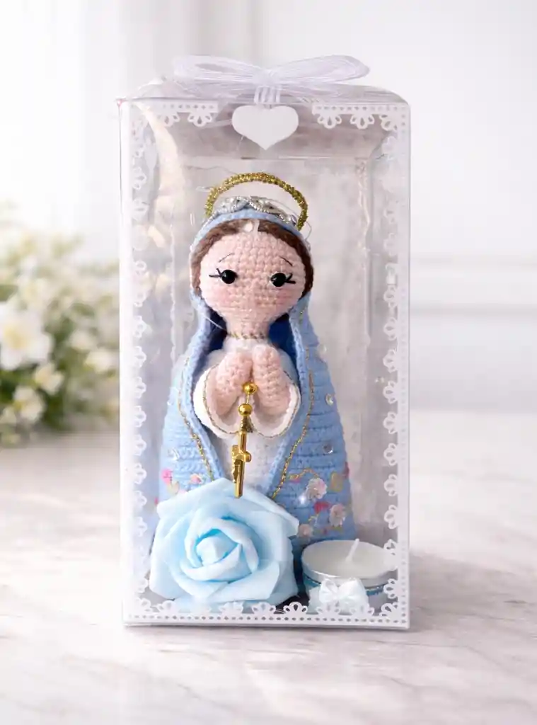 Sorprende a esa mujer que lo merece todo con un regalo lleno de fe y ternura. Hecho a mano: Virgen amigurumi tejida en material premium, bordada con flores y acabados dorados. (color a disponibilidad) Vitrina iluminada: Caja acrílica transparente con micro luces LED (pilas incluidas) lista para obsequiar. Accesorios incluidos: Mini rosario metálico dorado. Rosa tipo “eternal flower” en tono aqua. Vela pequeña de larga duración. Medidas: 20 cm alto (aprox.) vitrina 23 cm × 10 cm. Empaque seguro y tarjeta de “Feliz Día de la Madre”. ¡¡¡TU PEDIDO INCLUYE TARJETA!!! INGRESA EL MENSAJE QUE DESEAS ENVIAR EN: "COMENTARIO AL SHOPPER"