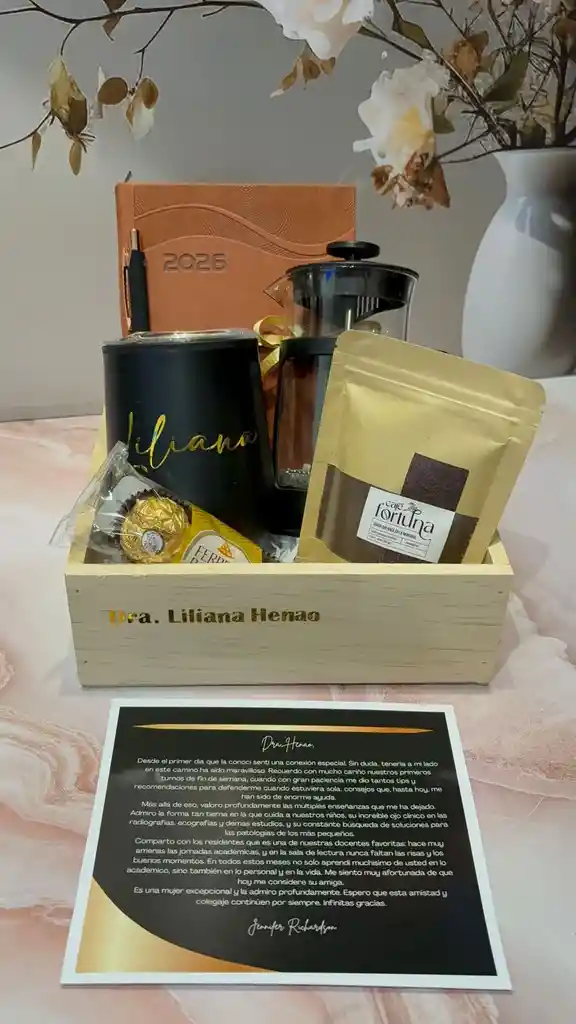 Box Momento Perfecto Descripción: Un detalle pensado para disfrutar sin prisas ✨ Incluye café artesanal, prensa francesa, agenda 2026, mug personalizado y chocolates selectos. Ideal para regalar calma, gratitud y buenos momentos. ☕📓💝 Nuestra caja se puede personalizar el motivo que desees, solo comunícate con nosotros al wasap 3123501815 y haz que tu experiencia con nosotros sea la mejor.