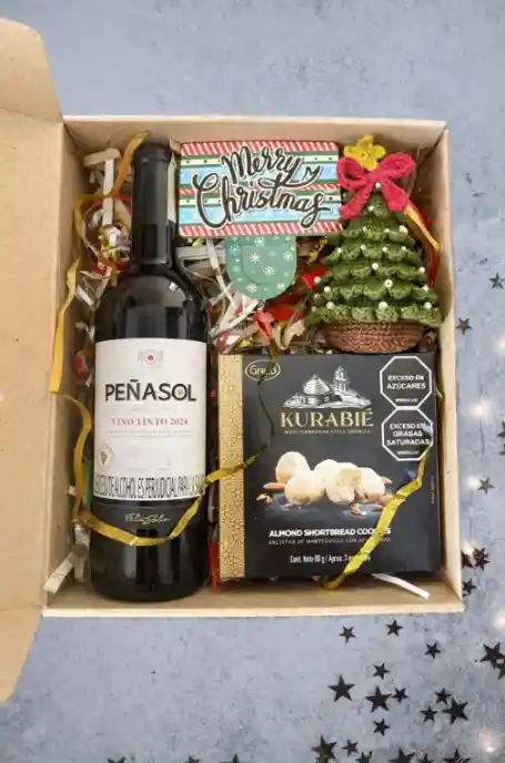 Box Navidad Incluye: 1 Botella De Vino Peñasol (750ml), 1 Caja Galletas Greco Kurabie (80g), 1 Arbol de Navidad Amigurumi 15cm (tejido a mano en crochet). Caja de temporada, Papel Picado, Moño Y Tarjeta navidad. TU PEDIDO INCLUYE TARJETA !!! INGRESA EL MENSAJE QUE DESEAS ENVIAR EN "COMENTARIO AL SHOPPER"