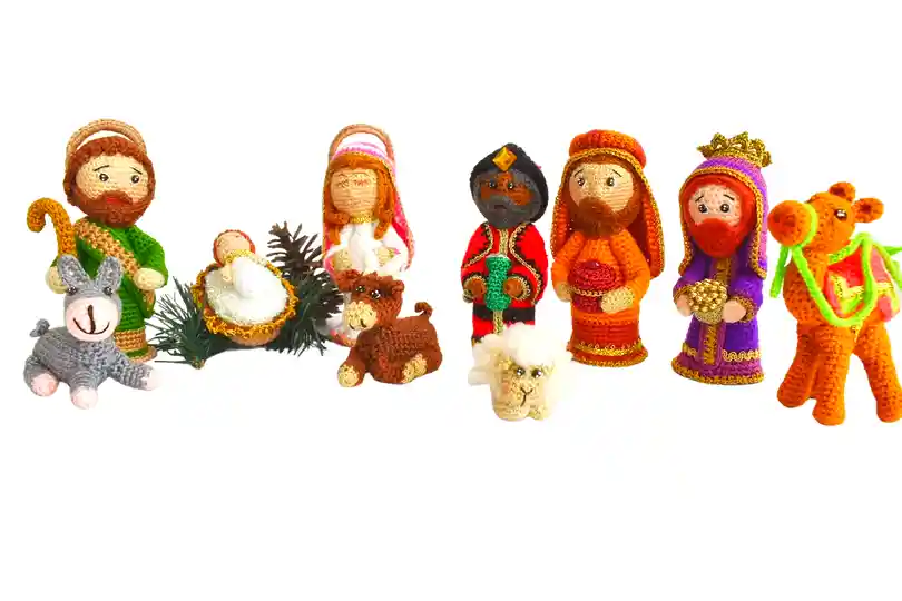 Pesebre tejido a mano en amigurumi, incluye 10 figuras en total; 5 figuras de aproximadamente 13 cm (San José, Vírgen María, tres reyes magos), niño Dios en cuna, buey, burro, oveja y camello.