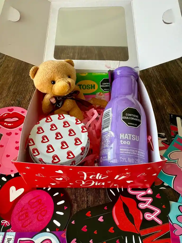 Incluye: 1 oso peluche 12cm, 1 Frasco en vidrio con gomas en forma de corazon y gomas de colores(190g), 1 Galleta Tosh Crema 24g, 1 Tè Hatsu Botella 250ml,. Caja a color con corazones, Tarjeta (disponible: cumpleaños, amor, feliz dia) TU PEDIDO INCLUYE TARJETA !!! INGRESA EL MENSAJE QUE DESEAS ENVIAR EN "COMENTARIO AL SHOPPER" La caja se envia en una bolsa sellada con sticker alusivo a la celebracion