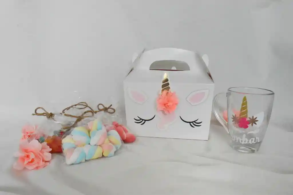 Incluye mug unicornio con mensaje personalizado, dulces variados, caja unicornio y tarjeta con mensaje personalizado. Enviar mensaje para la tarjeta y nombre para el mug vía chat.