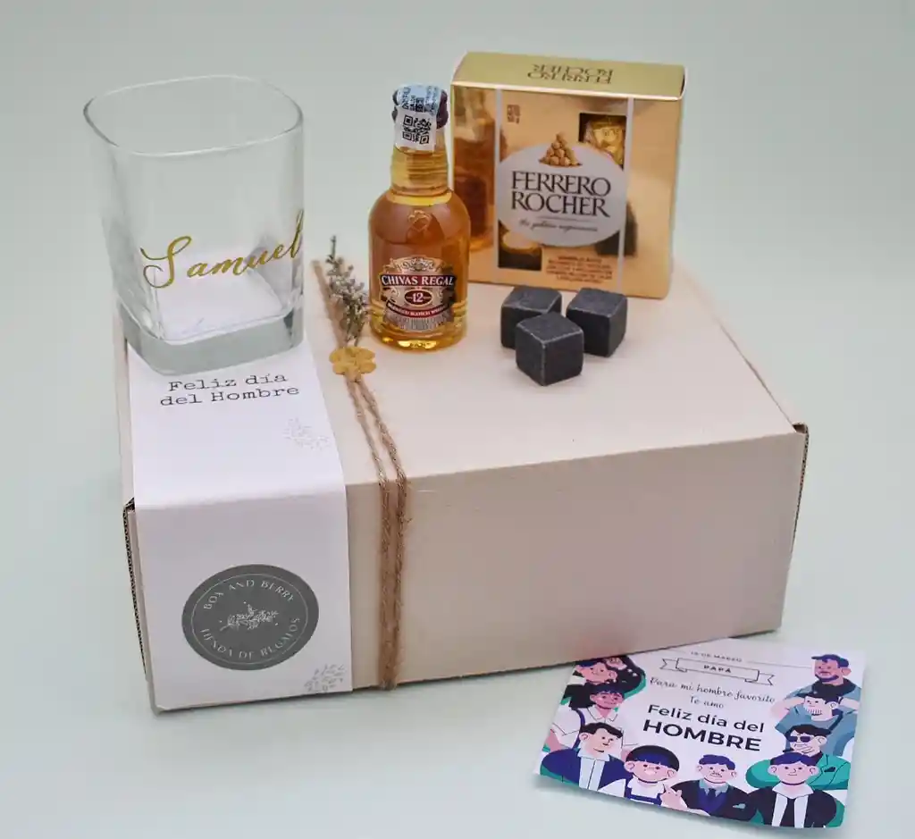 Vaso personalizado, mini Whisky Chivas, caja de chocolate Ferrero, hielos en piedra reutilizables, ponlos en el congelador y luego a tu bebida, tarjeta personalizada, empaque decorado de acuerdo a la ocasión. Enviar por favor mensaje para la tarjeta y el vaso vía chat