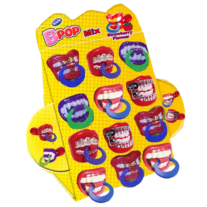 Chupete de caramelo duro adherido a un soporte plástico en forma de boca, sabor fresa o caramelo multicolor sabor fresa-cereza. Tapa de plástico que protege y cierra el caramelo