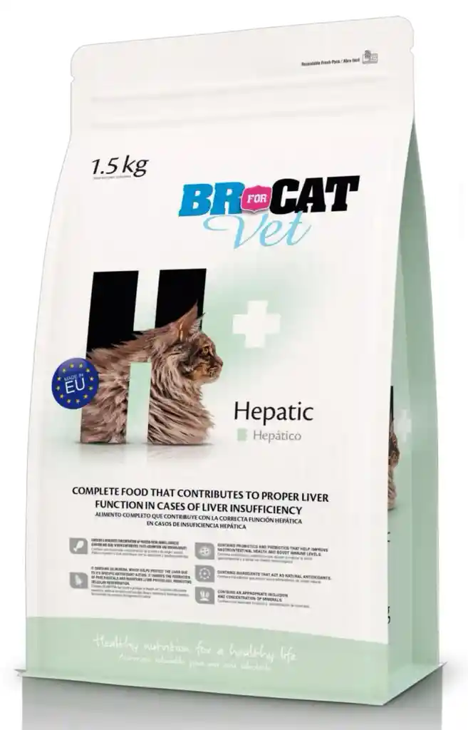 BR for Cat Vet Hepático es un alimento veterinario completo y especializado para gatos con insuficiencia hepática. Su fórmula está diseñada para apoyar la función hepática al tener un bajo contenido de cobre y sodio, un nivel moderado de proteína de alta calidad y un alto contenido de antioxidantes como vitaminas E y C y L-carnitina. El alimento también proporciona grasas altamente digestibles para dar energía, reduce la carga metabólica del hígado y promueve la regeneración celular, y se recomienda usar bajo supervisión veterinaria