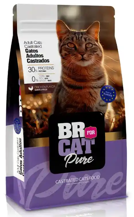 El alimento BR For Cat Pure Gatos Castrados sabor Pollo es una opción premium diseñada específicamente para controlar el peso y proteger la salud urinaria de gatos adultos esterilizados.